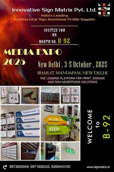 Discover premium architectural sign aluminum profiles at Media Expo Delhi 2025, designed to elevate your brand with creativity and durability. Our profiles offer innovative, long-lasting wayfinding solutions for sign makers, ensuring professional aesthetics and functionality. Join us from 03–05 October 2025 at Bharat Mandapam, Pragati Maidan, New Delhi, India, to explore our cutting-edge designs. Visit our booth to experience how our high-quality aluminum profiles, including options like the FSI 62mm, can transform your signage projects with sleek finishes and robust performance. Don’t miss this opportunity to enhance your brand presence!