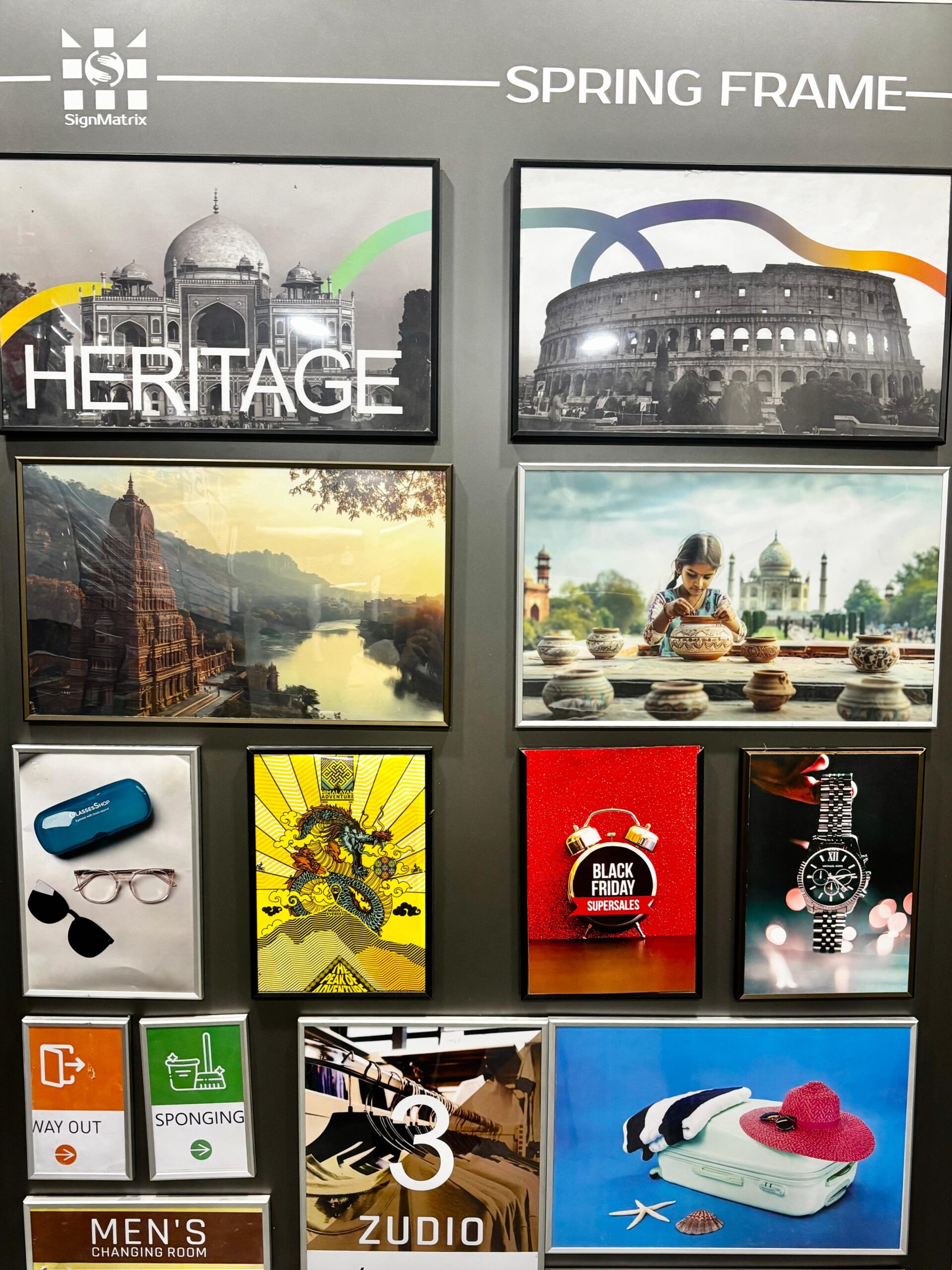 The Spring Frame is our most advanced and versatile product, designed to meet diverse retail display needs. Its innovative technology allows users to create custom illuminated or non-illuminated displays for applications like informative signs, collages, notice boards, POP signs, and corporate certificates. Featuring a unique push-spring system, it enables effortless display changes by simply squeezing the front protection sheet with your thumb.