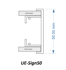 UE-Sign50 provides double-sided sign applications with a 50mm depth and a sliding mechanism for graphic sheets up to 5mm thick, delivering an elegant and refined design. The 8mm front collar enhances its sleek, modern aesthetic for wayfinding displays and other applications, while ensuring easy maintenance. The system supports both illuminated and non-illuminated wayfinding sign applications.